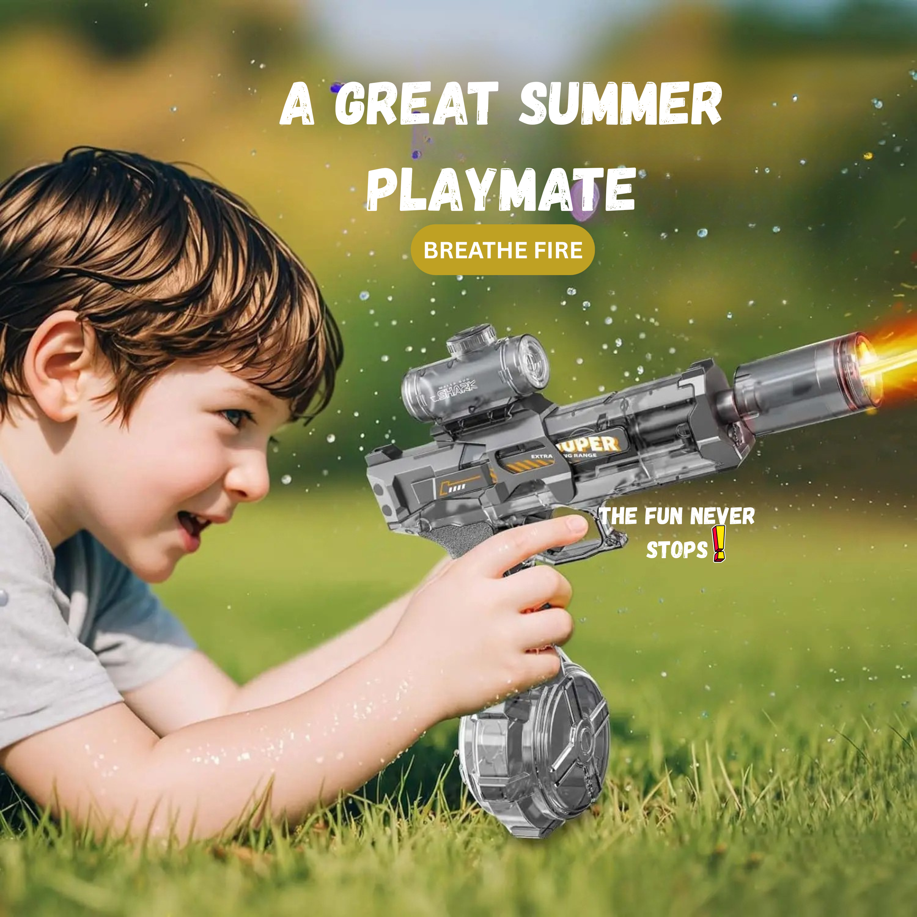 Advanced Features for Seamless Play. Ready for an upgrade? Our Electric Water Gun boasts more than just raw power. The striking Flash Muzzle emits a cool, illuminated light with every shot, adding an exciting visual dimension to your water fights. Powering up is simpler than ever thanks to the integrated USB Charging Port, allowing you to quickly top off the rechargeable battery and get back into the action. It's the perfect blend of eye-catching effects and practical design.